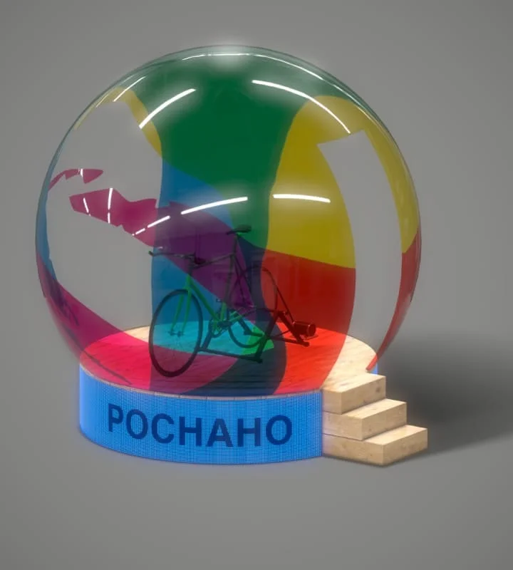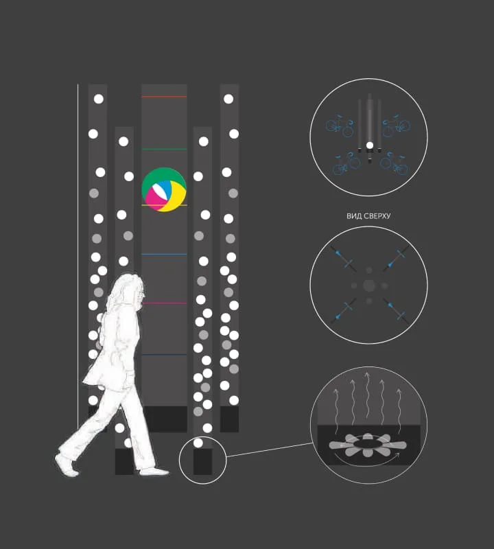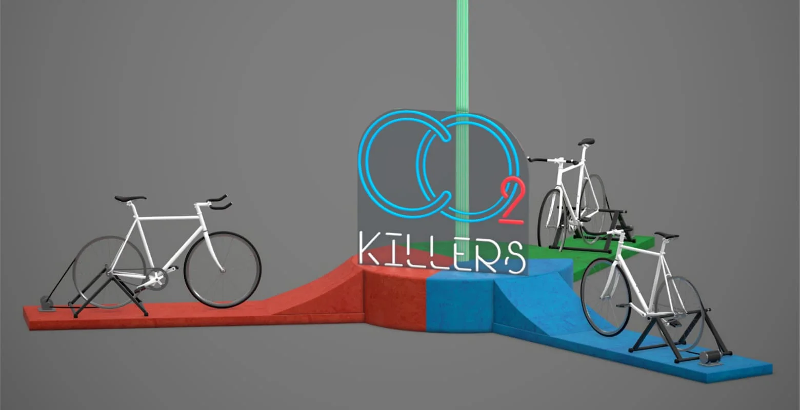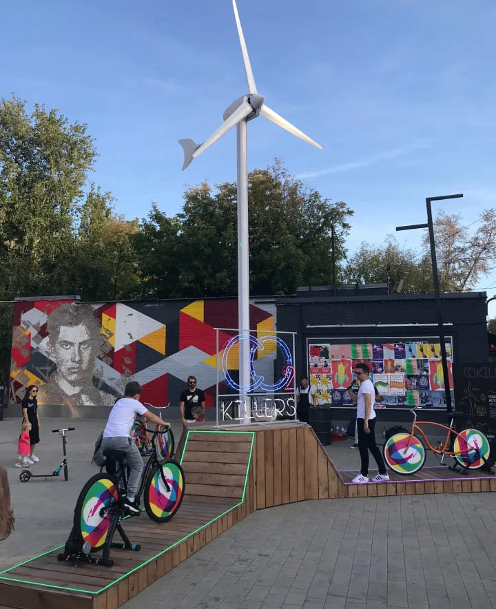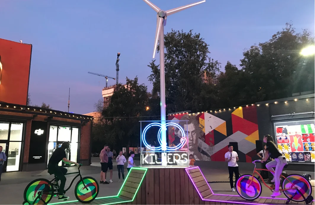 在设计之初,我们进行了一项分析研究,并提出了四个视觉方向。霓虹灯被选为风格主题,并以此为基础设计了几件艺术作品。“二氧化碳杀手”方案最终被采纳:人与展品之间的互动将传达人类行动的重要性。该方案的核心是利用自行车踩踏驱动风力涡轮机运转。自行车配备了速度传感器。根据踩踏速度,桅杆上的LED灯带会自下而上地发光。当速度最快的骑行者发出的光线照射到机舱时,螺旋桨叶片会根据踩踏速度变换颜色并开始旋转。.