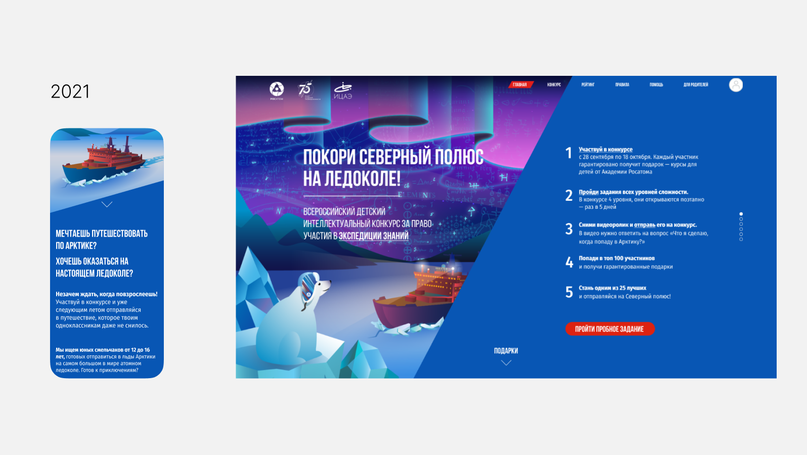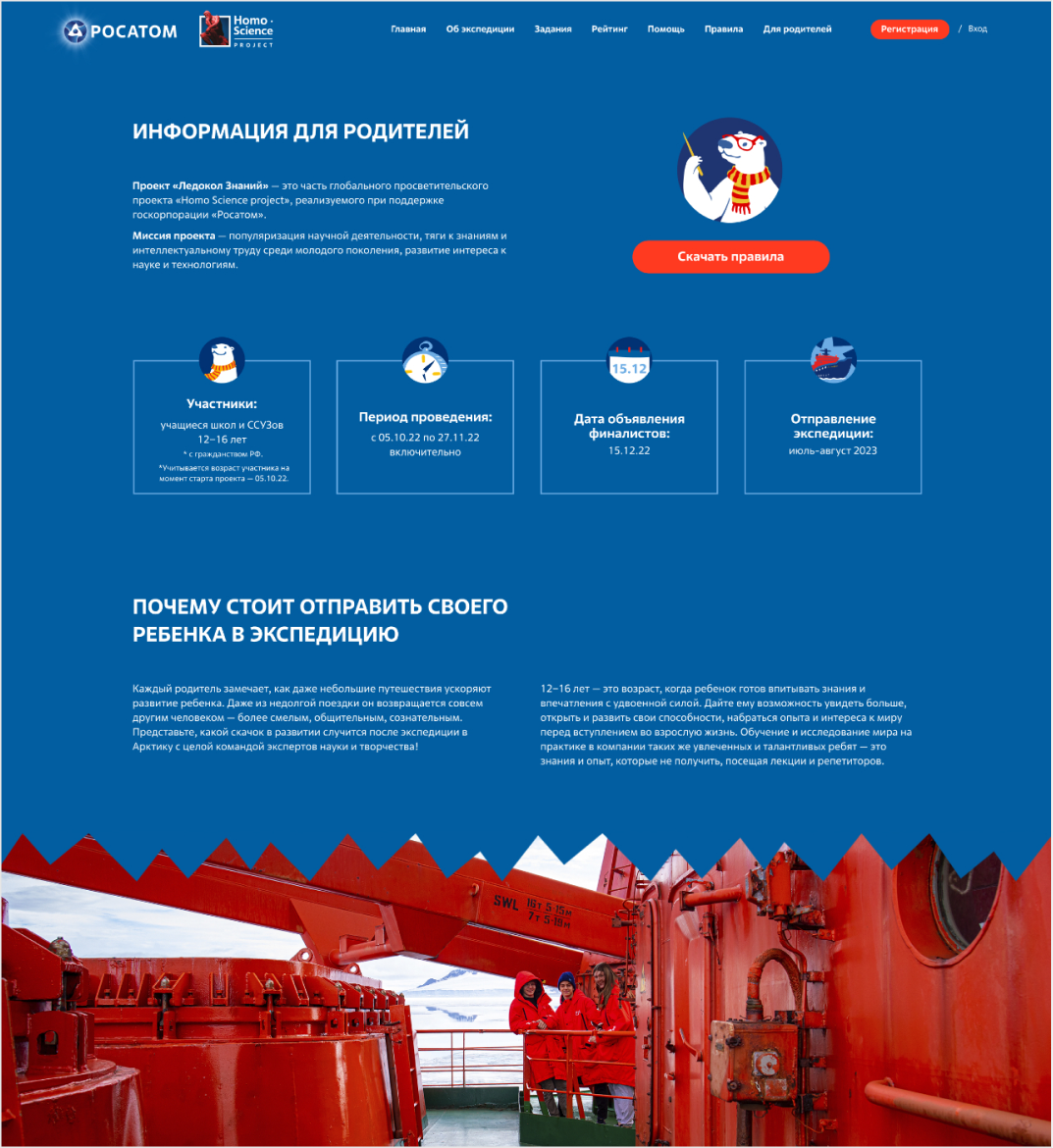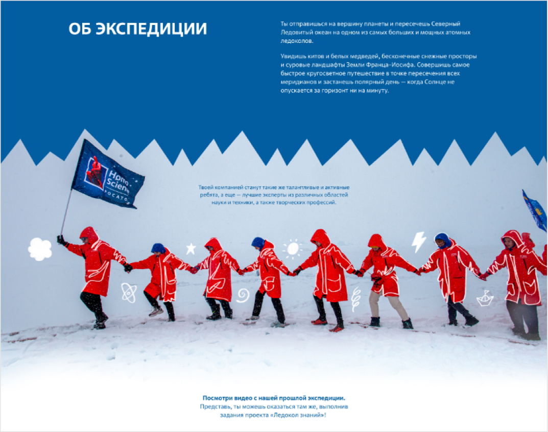 我们为«知识破冰之旅»项目打造了一套品牌形象,包括品牌标识、参与者纪念品、礼品海报、明信片、社交媒体图片、展示品和视频。在此,我们想重点展示为这项全国性教育项目“知识破冰之旅”创建的网站。»