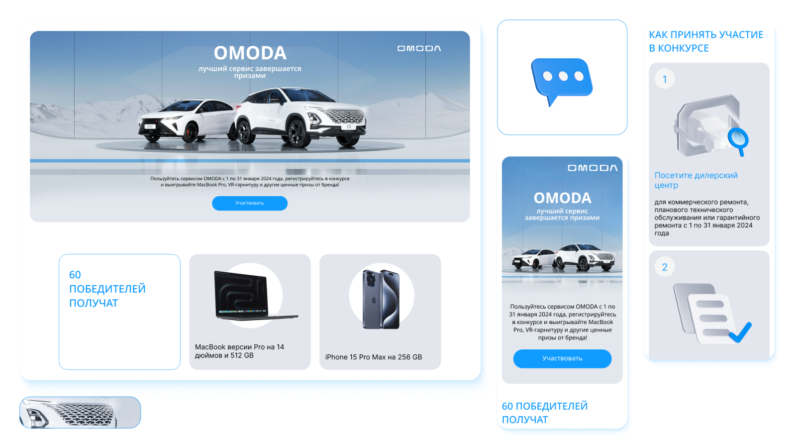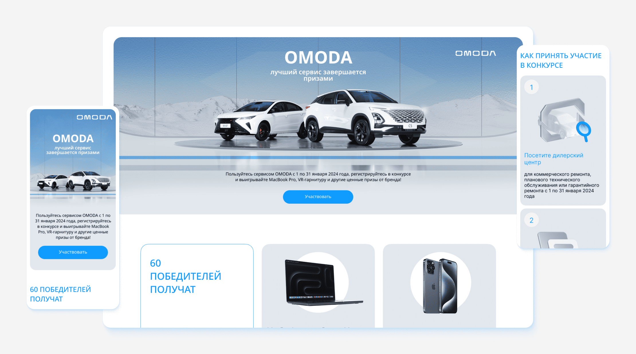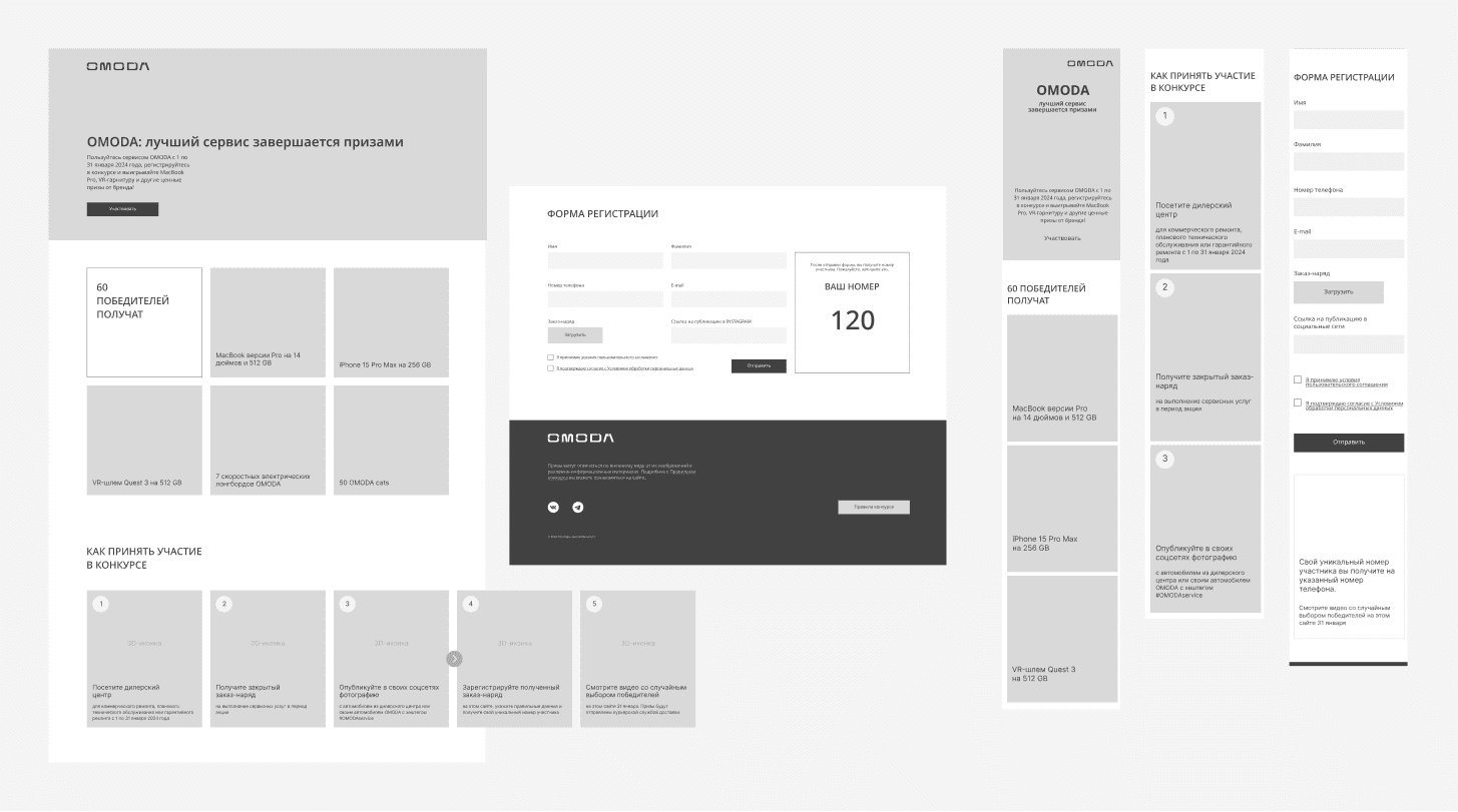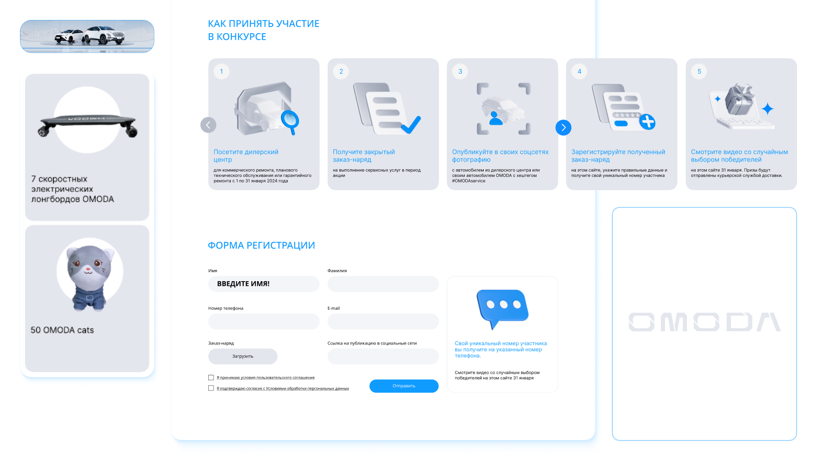 我们的目标是为汽车品牌 Omoda 在其服务中心客户中举办的抽奖活动开发活动页面和关键视觉元素。其中一项任务还包括实施移动端分发服务,用于发送唯一的参与者编号。.