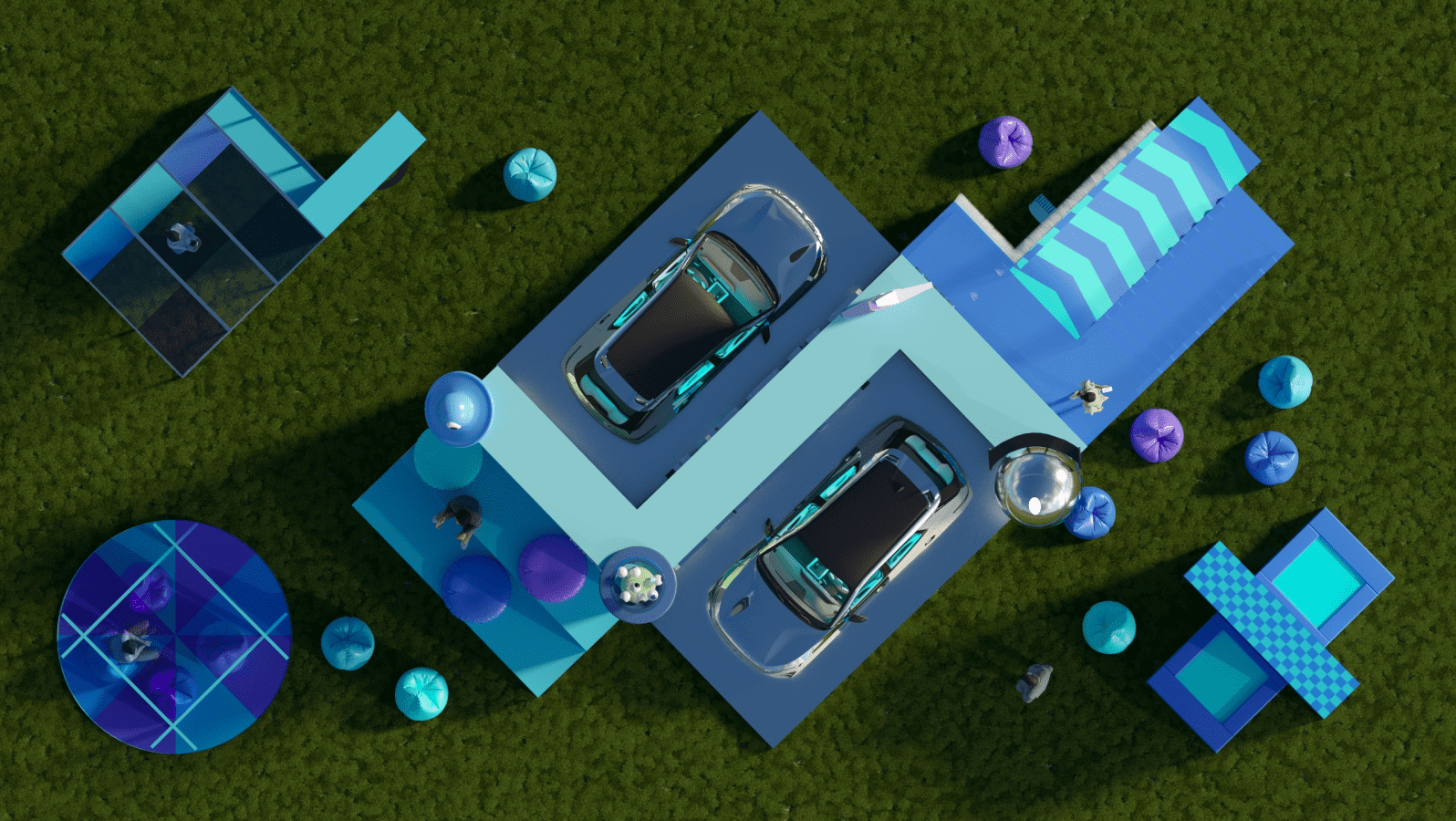 最终展台方案包括两个车辆展示区、一个带顶棚的阳台、一个冷藏休息室、一个带滑梯、蹦床和秋千的娱乐区,以及大量的座位。.