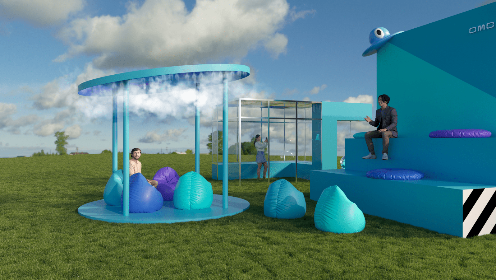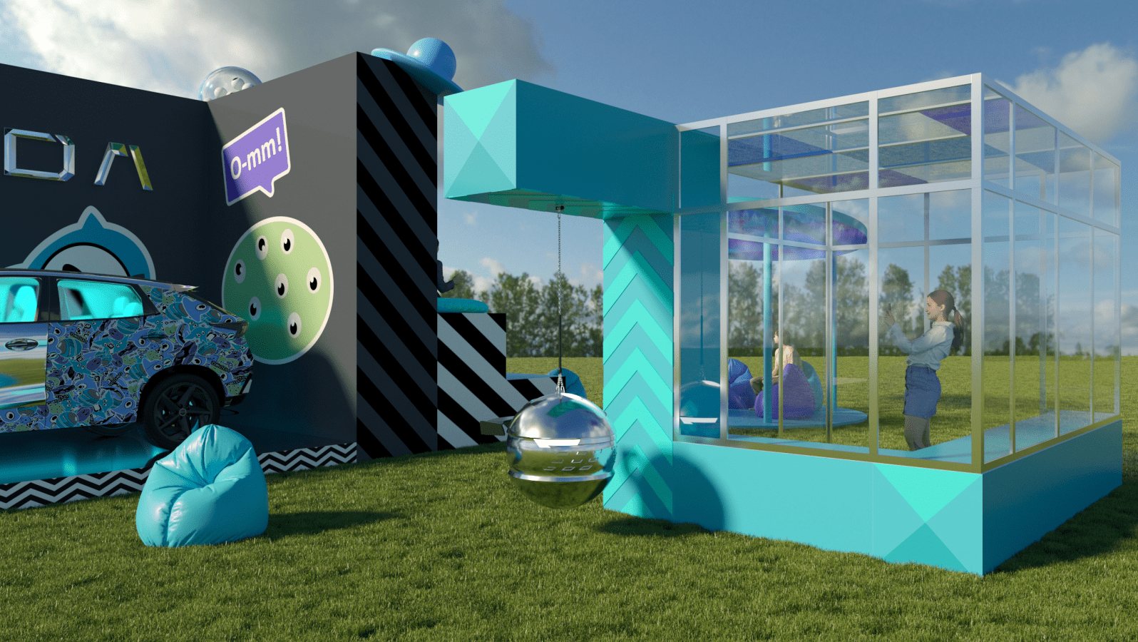 OMODA的品牌定位奠定了基调,因此我们选择了太空主题。考虑到活动的风格,我们决定为展位增添一丝奇趣,设计了外星人造型的贴纸。为了确保贴纸与整体风格协调一致,我们摒弃了流畅的太空主题线条,转而采用简洁的几何形状、独特的材料和色彩组合来设计展位。.