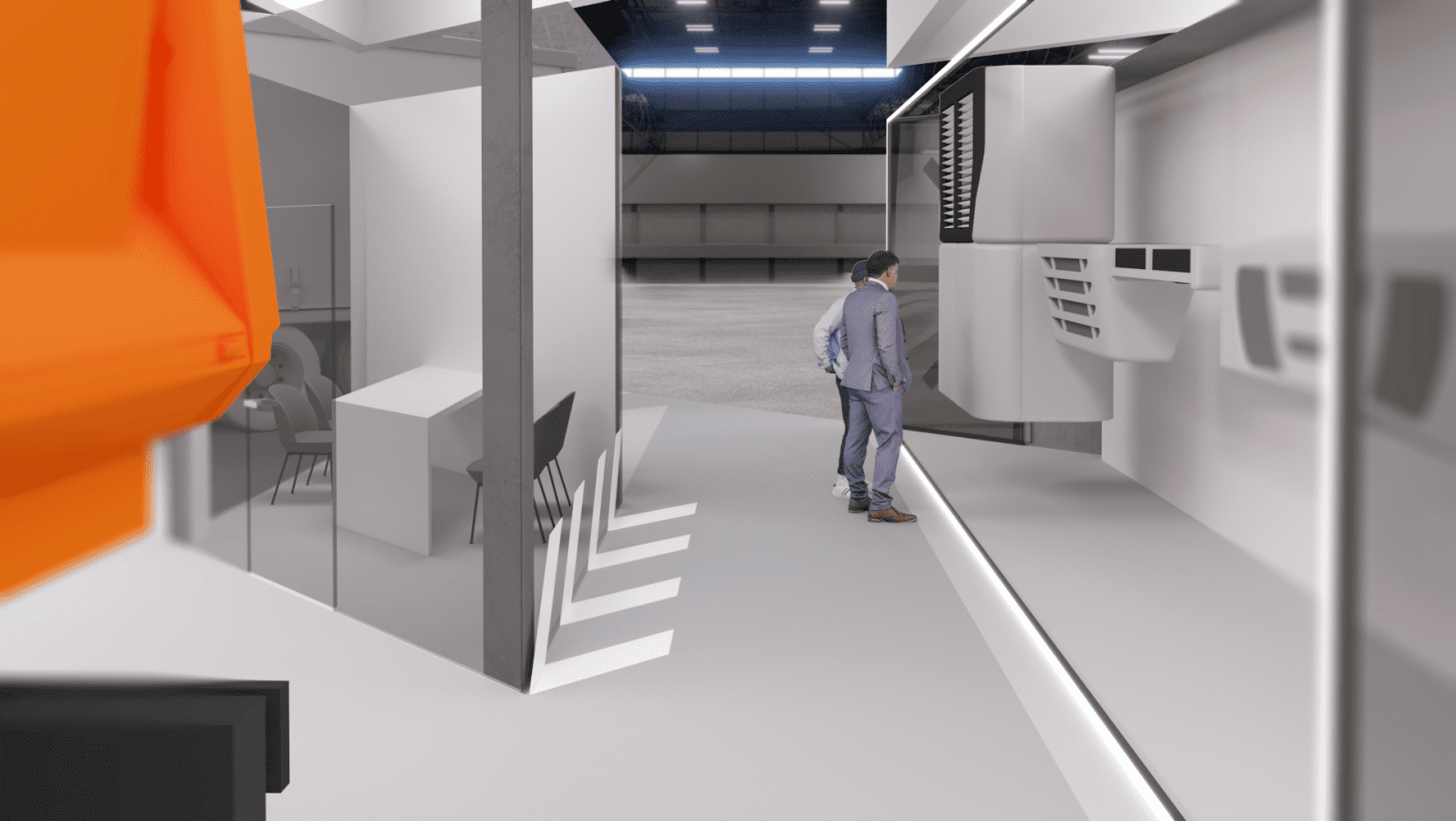 为了突出卡车的强劲动力,我们主要采用混凝土、金属和玻璃作为材料。为了减轻视觉上的沉重感,悬挂式结构被涂成白色。结合醒目的地面文字和灯光元素,最终呈现出令人印象深刻、现代简约的设计。.